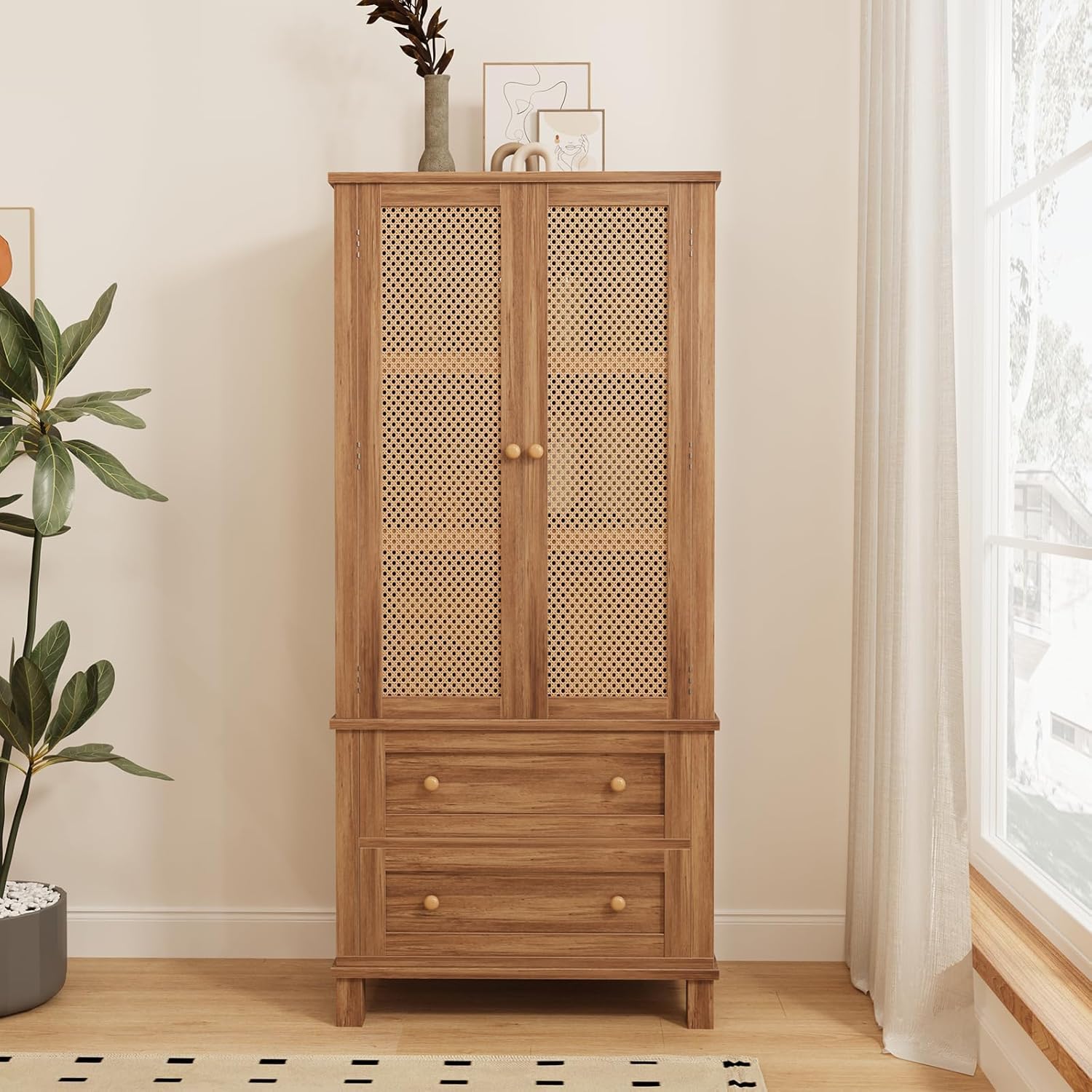 This 72-inch FOTOSOK model, which has four doors in total, rattan or woven-style doors, and adjustable shelves, blends contemporary storage with farmhouse style. It has a decorative finish and is made of engineered wood.